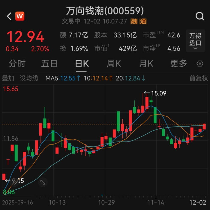 近两个月以来,万向钱潮股票开启了一轮震荡上行的行情,累计涨幅约50%,股价最高涨到15.09元/股,截至12月2日发稿,公司总市值达到429亿元。