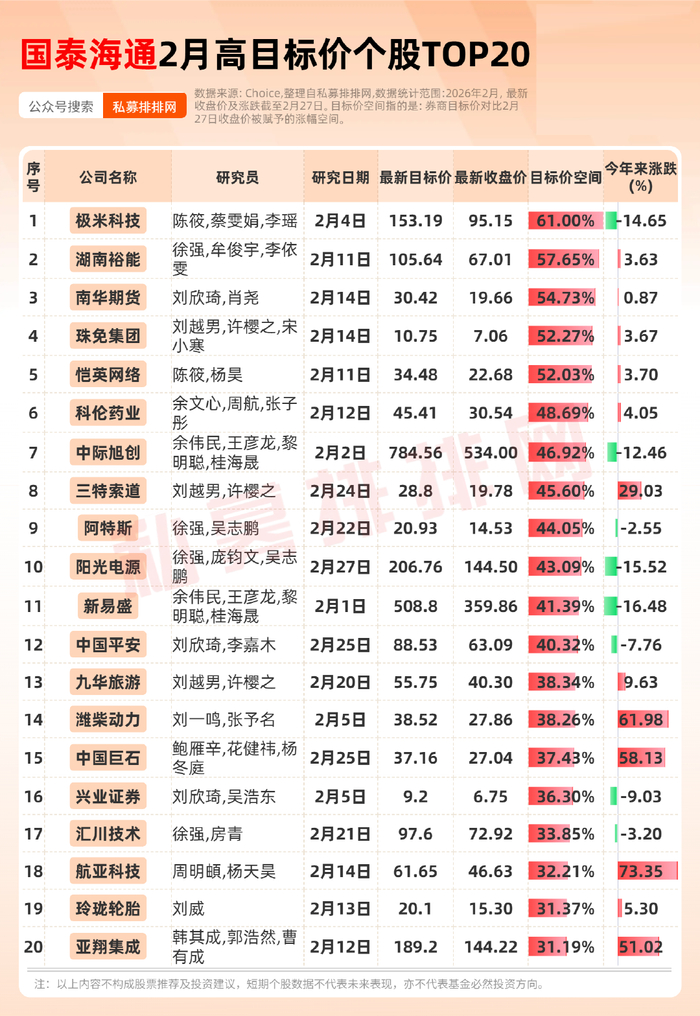 Choice数据显示,2月份国泰海通对A股58家上市公司进行了研究覆盖。目标价空间来看,相比2月27日收盘,目标价空间在50%以上的个股有5只,其中目标价空间最高的三只个股分别是极米科技、湖南裕能、南华期货。