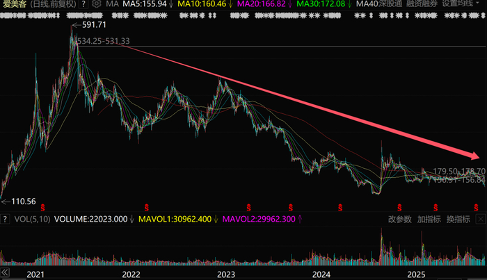 从2021年历史最高价到现在,爱美客4年多股价暴跌将近75%,这种腰斩之后再腰斩的走势,让高位买入的股民损失惨重。