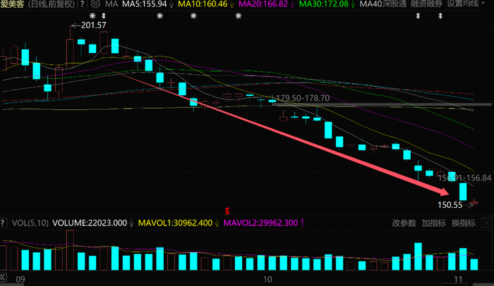9月11日至今,爱美客走出挡不住的单边下跌走势,从200元附近一路跌到如今的150元附近,短期跌幅高达25%左右。