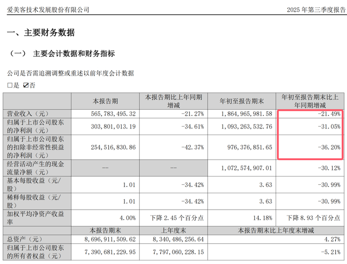 前几天,爱美客发布了2025年三季报。公司前三季度营收18.65亿元,同比下降21.49%;净利润10.93亿元,同比下降31.05%;扣非净利润9.76亿元,同比下降36.2%。