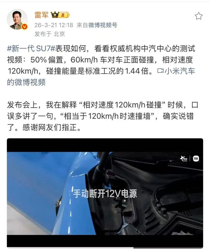 3 月 21 日午间,雷军发文,承认是口误多讲了 “相当于 120km/h 时速撞墙”,同时强调中汽中心的测试数据真实。