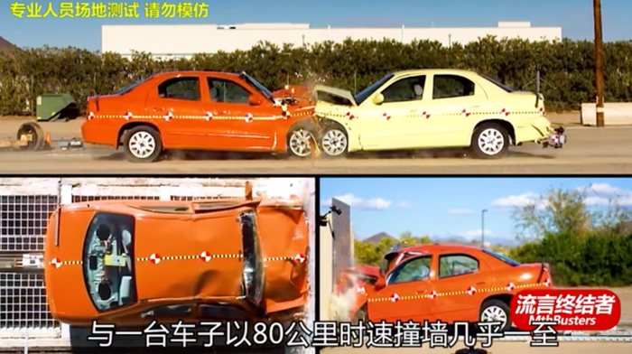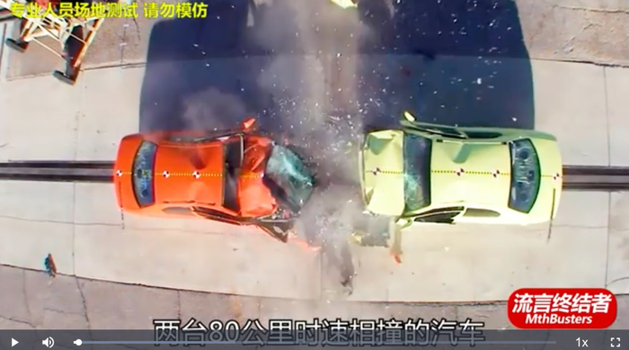 在《流言终结者》中就做过实车实验:两辆车 80km/h 对撞,车身溃缩程度、车内传感器 G 值,和单车 80km/h 撞墙几乎一样;而单车 160km/h 撞墙,车身溃缩大幅增加,冲击强度远远的超过前者。实验证明 “速度相加等于碰撞强度翻倍” 是错误的,雷军的表述,就是把相对速度和碰撞能量混为一谈,犯了基础物理错误。