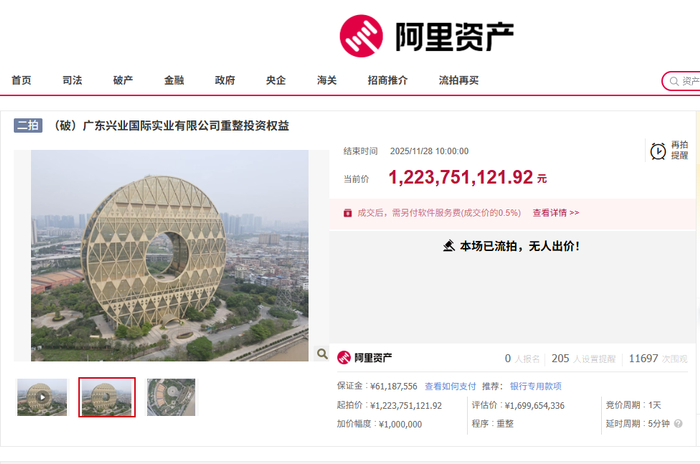 阿里资产平台显示,该拍品为广东兴业国际实业有限公司重整投资权益,所有人为广东兴业国际实业有限公司,权利来源为“破产重整”。
