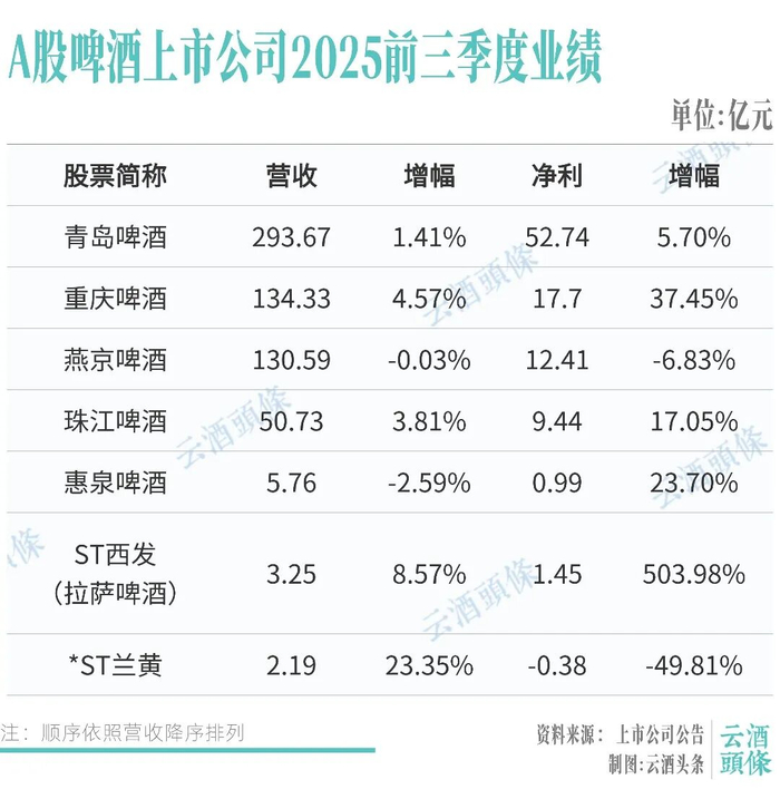 7家A股上市啤酒企业中,5家企业实现营收增长,其中*ST兰黄(兰州黄河)以23.35%的增速领跑,重庆啤酒、惠泉啤酒则小幅下滑;净利润方面,5家企业同比增长的企业中,ST西发(拉萨啤酒)增速高达503.98%,而下跌的2家企业中,*ST兰黄以49.81%的降幅居前。