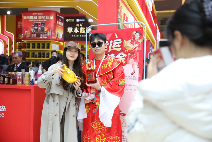 为了营造气氛,海南椰岛设计了NPC财神穿梭展位环节,邀请消费者合影打卡。在互动区,准备了关于海南椰岛品牌的小挑战—从鹿龟酒的百年传承,到黄金椰汁的经典味道,答对问题,消费者即可赢取刮刮卡,开启小惊喜。