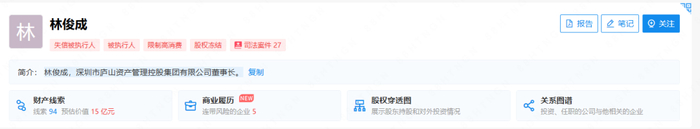 企查查显示,林俊成牵涉多起司法诉讼,案件类型以民间借贷纠纷为主,为失信被执行人,被限制高消费。
