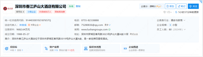 易简财经查询到,深圳春江庐山大酒店有限公司的法人代表兼总经理,名叫林俊成,同时也是深圳庐山集团的董事长。