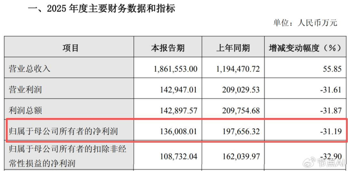 业绩快报显示,石头科技2025年归母净利润为13.60亿元,同比骤降31.19%,为2020年上市以来最大年度跌幅,且2024年、2025年连续两年下滑,2025年跌幅显著扩大。