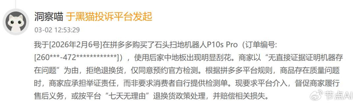 比如,有消费者反映,花费两千多元购买的石头洗拖一体机在两个月内4次返厂维修;亦有用户抱怨,新购的P10s Pro扫地机器人划伤地板,售后却以“无直接证据证明机器存在问题”为由拒绝退换。