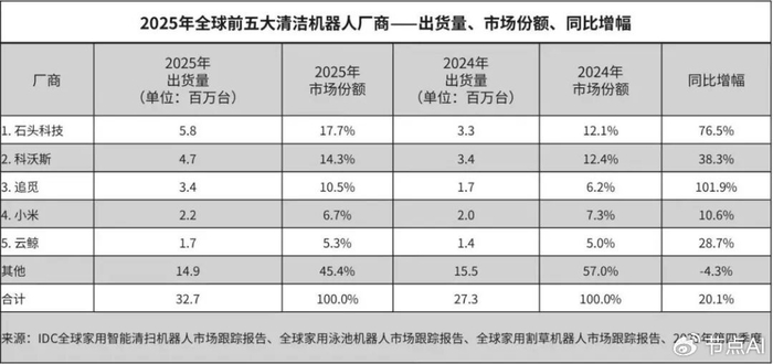 根据IDC最新报告,2025年,全球智能扫地机器人市场整体出货量达到 3272 万台,石头科技以580万台的量级,夺得17.7%的份额,稳居行业第一;排在二至四名的分别是科沃斯、追觅、小米和云鲸,对应市场份额14.3%、10.5%、6.7%、5.3%。