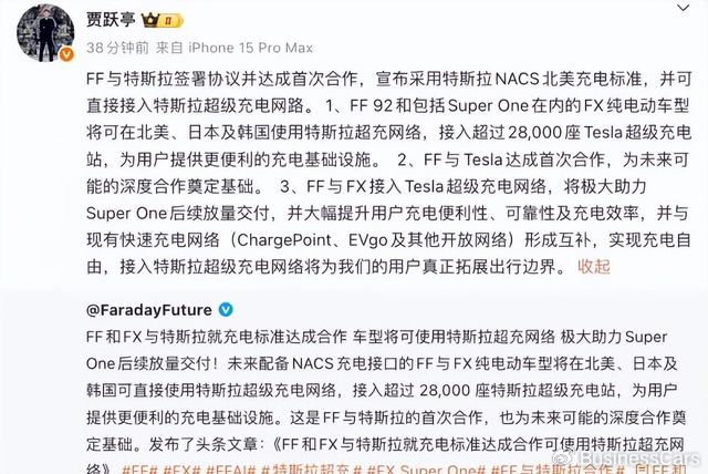 贾跃亭带着他的FF接入了特斯拉的充电网络。按协议,从2025年开始,FF旗下的车都能全部使用特斯拉在北美和日韩的超级充电网络。