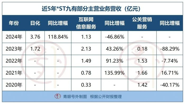 也是在这一年,日化和互联网信息服务成了*ST九有营收的主要来源,分别为1.72亿元和2.13亿元。公关营销服务业务规模骤然“缩水”,营收同比下滑88.29%,由前一年的1.53亿元降至0.18亿元。