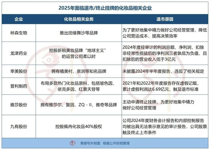据青眼号外不完全统计,2025年以来至少有6家化妆品相关企业面临退市/终止挂牌风险。其中,普利制药、龙津药业和*ST九有为A股退市企业;幸美股份、林森生物和雅莎股份则为新三板摘牌企业。