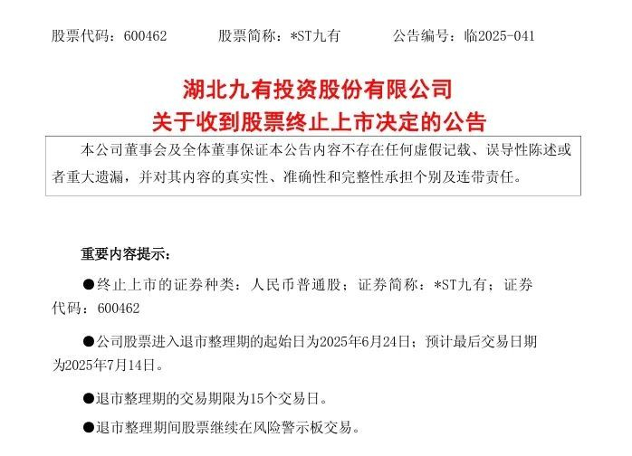 6月16日,湖北九有投资股份有限公司(下称:*ST九有)发布公告称,上海证券交易所决定终止公司股票上市。