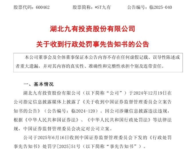 截自上海证券交易所官网根据《行政处罚事先告知书》,*ST九有及有关责任人存在两项违法事实:一是2020年年度报告存在重大遗漏和虚假记载;二是2021年至2023年年度报告存在虚假记载。