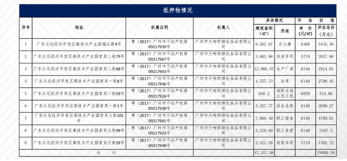 据招商公告显示,本次处置的债权包括贷款本金1.09亿元及相应利息、垫付费用。抵押物为天吻娇颜位于广州从化经济开发区高新技术产业园内的9处工业房产,经评估总价值达2.82亿元。