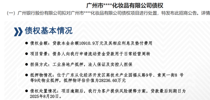 据悉,天吻娇颜流动资金贷款目前已出现逾期情况。尽管广州银行已采取风险缓释措施,但鉴于2025年8月20日的最终还款期限临近,银行方面决定启动公开处置程序。
