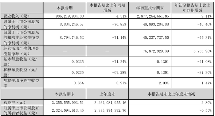 在盈利指标方面,股东回报水平同步下降。据财报内容,本季度基本每股收益为0.0235元/股,同比下降71.24%;年初至报告期末基本每股收益0.1301元/股,同比下降41.08%。