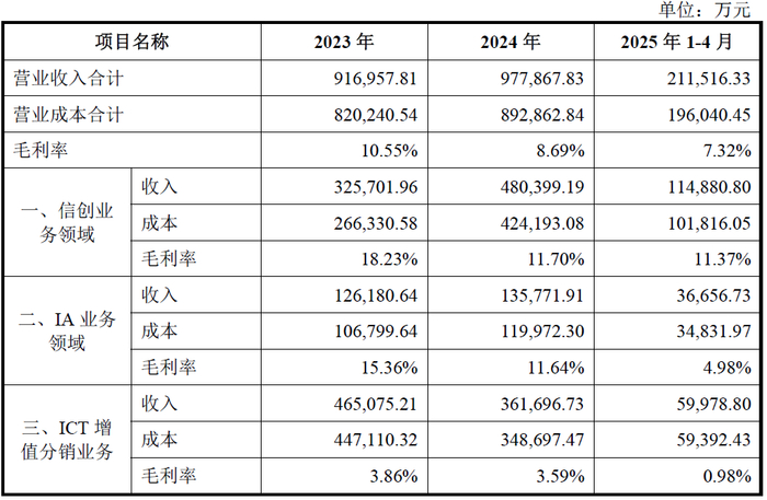 其中,信创业务2023年毛利率为18.23%,到2024年降至11.7%,2025年1到4月跌至11.37%,原因在于党政、金融客户压价采购,叠加国产芯片供应链成本高企;IA业务毛利率直接“自由落体”,2023年毛利率为15.36%,2024年骤降至11.64%,2025年1到4月断崖式下跌至4.98%;ICT增值分销业务毛利率最低,从2023年的3.86%跌至2025年1-4月的0.98%,近乎沦为 “赔本赚吆喝” 的通道业务。