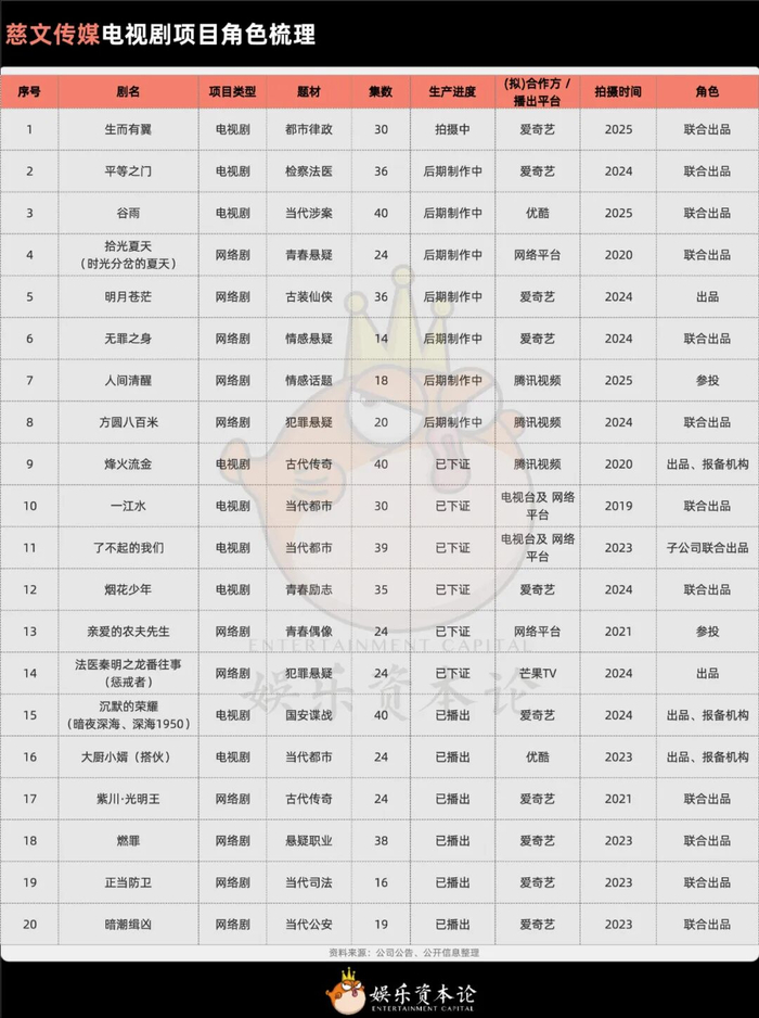 以慈文传媒披露的电视剧项目为例,小娱逐条研究了各阶段项目中慈文传媒所处的角色,发现:1)由慈文自己报备并出品的项目的比重已经较低,且集中在2024年及之前;2)2025年开机的项目中,慈文都是以联合出品或参投的形式出现。