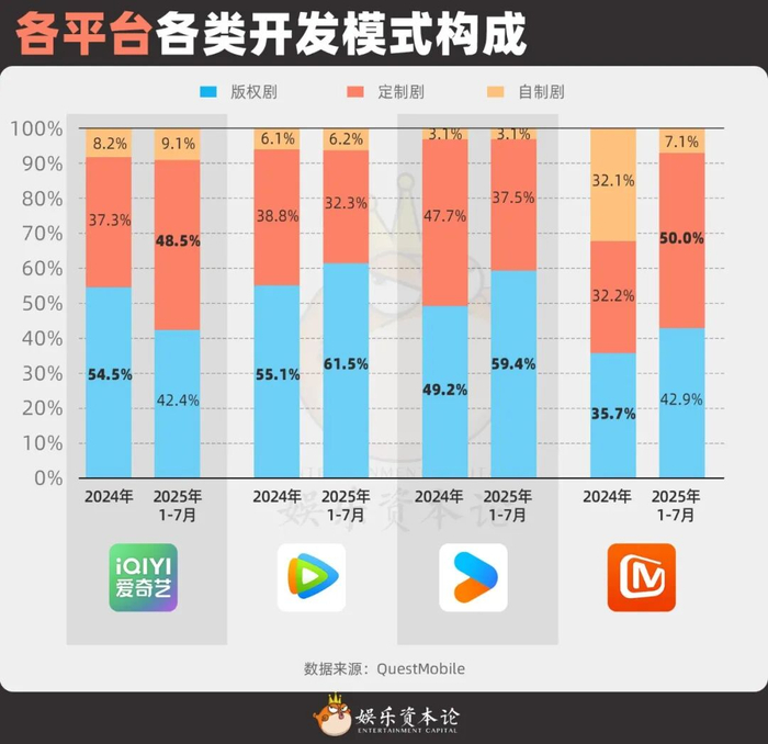 根据QuestMobile数据,2025年播出的定制剧比重超过版权剧,占据播出剧集的半壁江山。而徳塔文数据则显示,由视频平台主导的定制剧份额在2023年便已然超过版权剧。制片人向小娱表示,从目前各个平台的规划来看,未来版权剧的份额或将出现断崖式下滑。