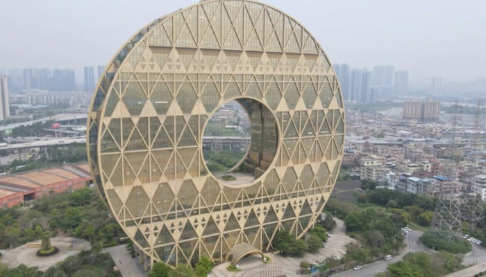 该建筑的设计灵感源自“水轮车”,其与珠江水中的倒影形成“8”字形状,寓意着塑料交易的繁荣。但因其外形酷似一枚巨大铜钱,被网友形象地称为“铜钱大厦”,并引发“最丑建筑”争议。