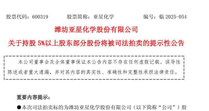 11月26日晚间,潍坊亚星化学股份有限公司(证券代码:600319.SH)发布提示性公告,披露公司持股5%以上股东潍坊亚星集团有限公司所持1319.28万股无限售流通股将被司法拍卖。