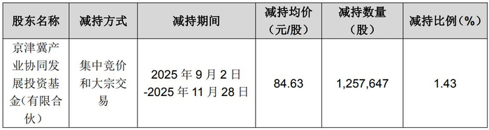 具体来看,2025年9月2日至2025年11月28日,京津冀基金以集中竞价和大宗交易方式累计减持公司股份125.76万股,减持比例为1.43%,减持均价为84.63元/股,合计套现1.06亿元。