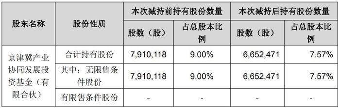 公告显示,近日,公司收到了股东京津冀产业协同发展投资基金(有限合伙)(以下简称“京津冀基金”)出具的《关于股份减持计划期限届满的告知函》,京津冀基金减持计划期限已于2025年11月29日届满。