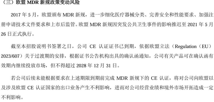 若到期前未能完成MDR新规要求的CE认证,公司境外出口业务及经营业绩将受到不利影响。