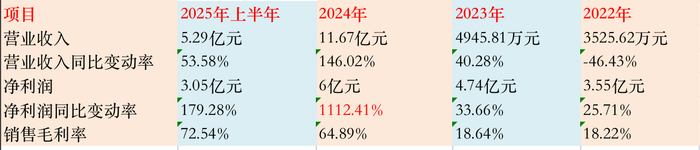值得注意的是,泰达新材2024年业绩出现爆发式增长:净利润从2023年的4945.81万元飙升至6亿元,同比增幅高达1112.41%,远超其营业收入146.02%的同比增幅(2024年营收11.67亿元)。与之相应,销售毛利率也从2023年的18.64%跃升至2024年的64.89%。2025年上半年,公司继续保持高增长,营收5.29亿元(同比增53.58%),净利润3.05亿元(同比增179.28%),销售毛利率高达72.54%。