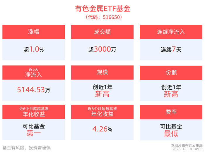 统计显示,有色金属ETF基金(516650)近7天获得连续资金净流入,合计“吸金”1.44亿元,截至12月17日,产品最新份额达13.91亿份,最新规模达24.17亿元,均创成立以来新高。