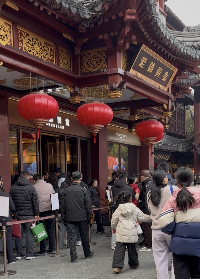 界面时尚实地探访了有“上海水贝”之称的豫园商圈。多家黄金珠宝品牌沿街分布,即便是在2月2日这样一个周一的工作日下午,商圈内依然保持着不低的人流密度。商场入口处不断有游客和消费者进出,部分门店门口需要排队等候,头部黄金饰品柜台前也常有客人驻足。
