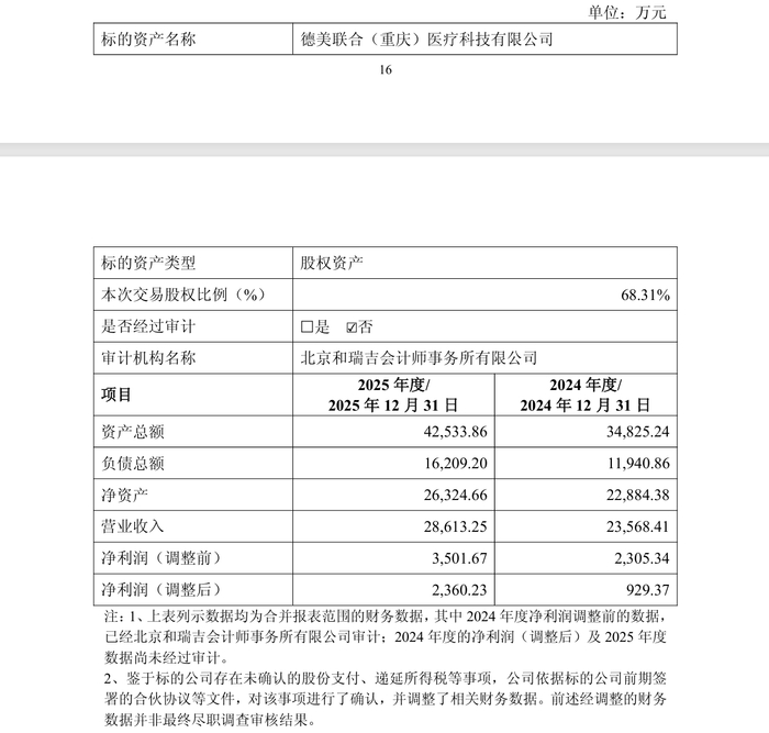 另外,本次收购设置业绩对赌,即2026年至2028年,德美医疗各年度经审计净利润分别不低于4500万元、5500万元、6500万元,或累计净利润不低于1.65亿元。也就是该公司需至少实现前述一项业绩目标。
