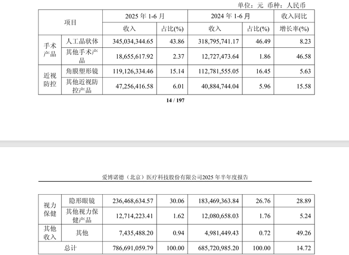 数据来源:妙想Choice。界面新闻记者陈杨制图具体而言,2024年5月起,人工晶状体国家集采落地。另外,爱博医疗在2025年8月的调研活动中提及,由于医保控费及白内障筛查活动受限,2025年上半年行业整体白内障手术量呈小幅下滑趋势,公司手术治疗板块(人工晶状体)剔除国际业务和新品“龙晶”(有晶体眼人工晶状体)后,收入实则下滑。