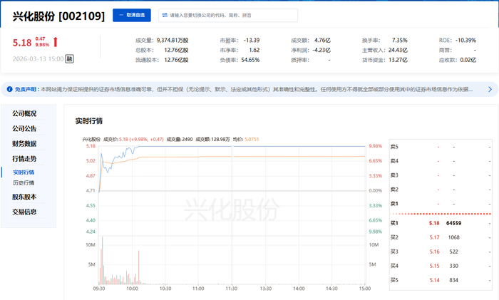 3月13日,兴化股份(002109)以放量涨停态势领涨陕西板块,其走势受板块联动、资金推动及地缘局势等多重因素影响。