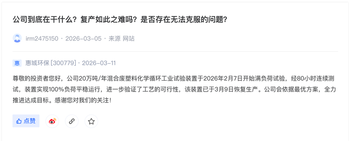 2026年3月11日,青岛上市公司惠城环保科技集团股份有限公司(股票代码:300779.SZ)在深交所互动易平台披露,公司旗下20万吨/年混合废塑料化学循环工业试验装置已于3月9日正式恢复生产。该装置于2026年2月7日启动满负荷生产试验,历经80小时连续不间断运行,成功实现100%负荷平稳运转。