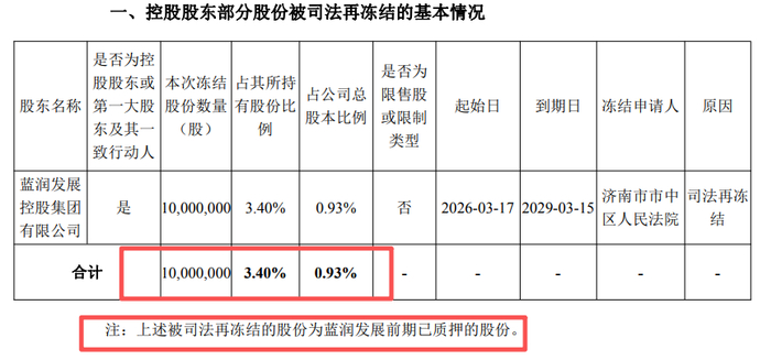 根据公告,此次股份冻结申请人为济南市市中区人民法院,冻结时间自2026年3月17日起至2029年3月15日。被冻结的1000万股股份占蓝润发展所持公司股份的3.40%,占公司总股本的0.93%。