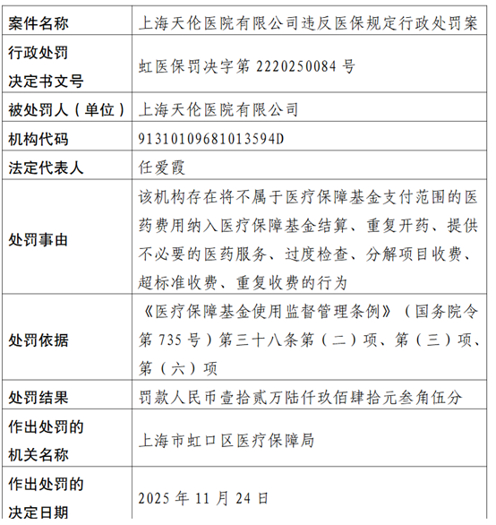 虹口区医疗保障局于2025年11月24日下发的行政处罚案显示,上海天伦医院存在将不属于医疗保障基金支付范围的医药费用纳入医疗保障基金结算、重复开药、提供不必要的医药服务、过度检查、分解项目收费、超标准收费、重复收费的行为。