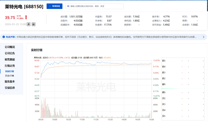 3 月 25 日,A 股硬科技赛道集体活跃,光通信 / CPO与显示材料方向情绪高涨,陕西板块莱特光电 (688150)顺势爆发,全天震荡上行,以+11.59% 的涨幅领跑板块,成为当日陕西板块最抢眼标的。