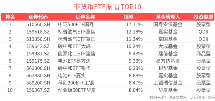 截至今日收盘,中证500ETF国寿、标普油气ETF嘉实、标普油气ETF富国振幅居市场前列,分别达17.11%、12.18%、11.34%。