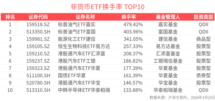 截至今日收盘,标普油气ETF嘉实、标普油气ETF富国、能源化工ETF建信换手率居市场前列,分别达479.42%、403.96%、341.05%。行业主题类ETF共计8只,分别是标普油气ETF嘉实、标普油气ETF富国、恒生生物科技ETF易方达、港股通汽车ETF汇添富、港股汽车ETF工银、港股通汽车ETF华夏、港股通汽车ETF华宝、中韩半导体ETF华泰柏瑞。