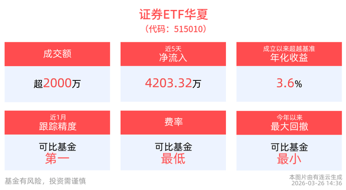 跟踪精度方面,截至2026年3月25日,证券ETF华夏近1月跟踪误差为0.003%,在可比基金中跟踪精度最高。