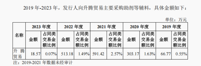 其中,升腾贸易是金戈新材的“专属”供应商,其客户只有金戈新材,2019年10月与公司开始合作,2023年3月终止合作。金戈新材主要向升腾贸易采购助剂等辅料,2019-2023年,采购金额为66.77万元、303.17万元、591.42万元、513.18万元、18.57万元。