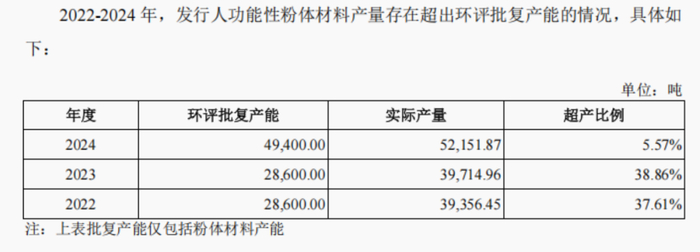 价格的下跌也确实带来了销量的增长,但这也导致金戈新材的产量存在超出环评批复产能的情况。2022-2024年,金戈新材超产比例达到37.61%、38.86%、5.57%。直到IPO前的2025年,产能利用率才降至94.96%并完成整改。