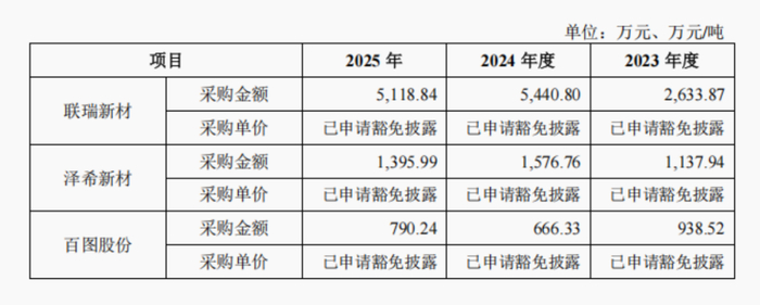但是,2022-2025年,联瑞新材、泽希新材、百图股份不仅是前五大供应商,同时被公司列为主要竞争对手。其中,2023-2025年,公司向联瑞新材、泽希新材和百图股份,采购球形氧化铝金额合计占报告期内采购总额比例高达91.4%。