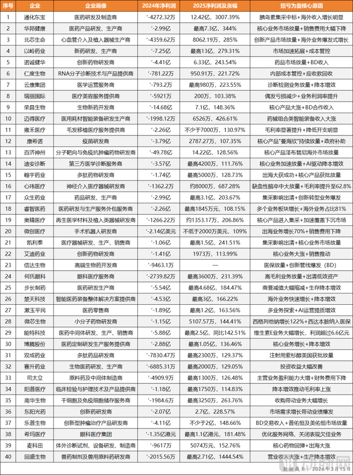 事实上,在2025年实现扭亏为盈的40家医疗企业中,有不少其实已经站在了“生死边缘”。