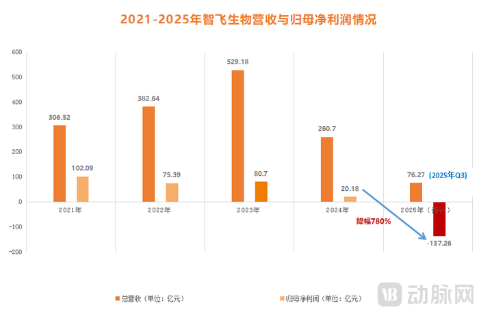 于是,在“扭亏为盈”的另一边,是大量医疗企业正处于亏损的泥潭。据动脉网不完全统计,截至2026年3月15日,在已发布2025年年报或全年业绩预告的近300家医疗企业中,仍有超过一半的净利润为负值,其中降幅达到两位数的占比30%,最为夸张的是智飞生物,其在2025亏损106.98亿元~137.26亿元,同比下降630%~780%。