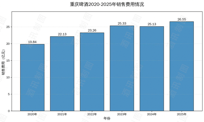 2025年,重庆啤酒销售费用为26.55亿元,同比增长5.66%,销售费用率为18.03%,同比增长0.88%。拉长时间线看,自2020年完成与嘉士伯中国资产整合以来,公司销售费用总体呈上升趋势,从2020年的19.84亿元逐步增长至2025年的26.55亿元。
